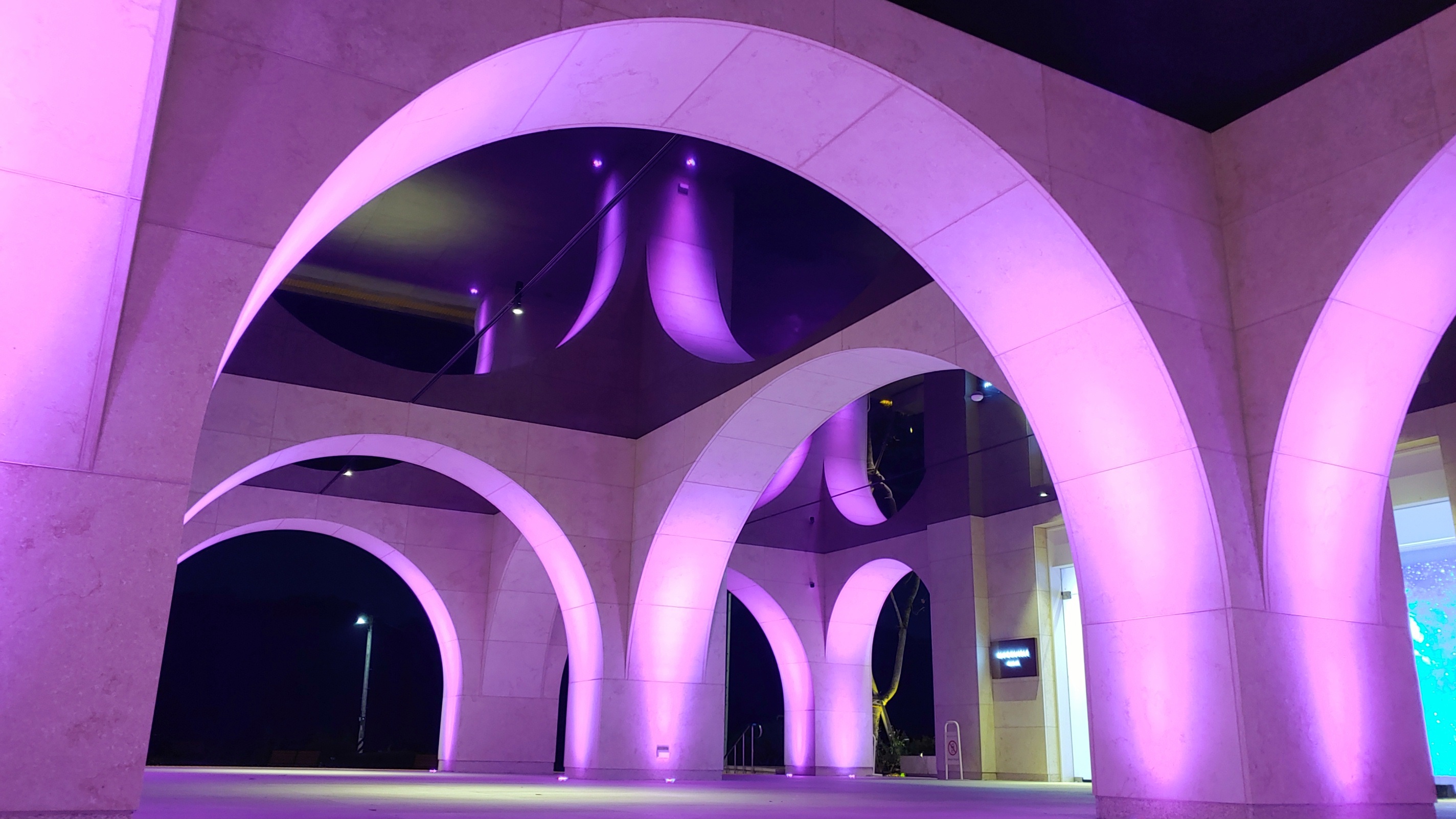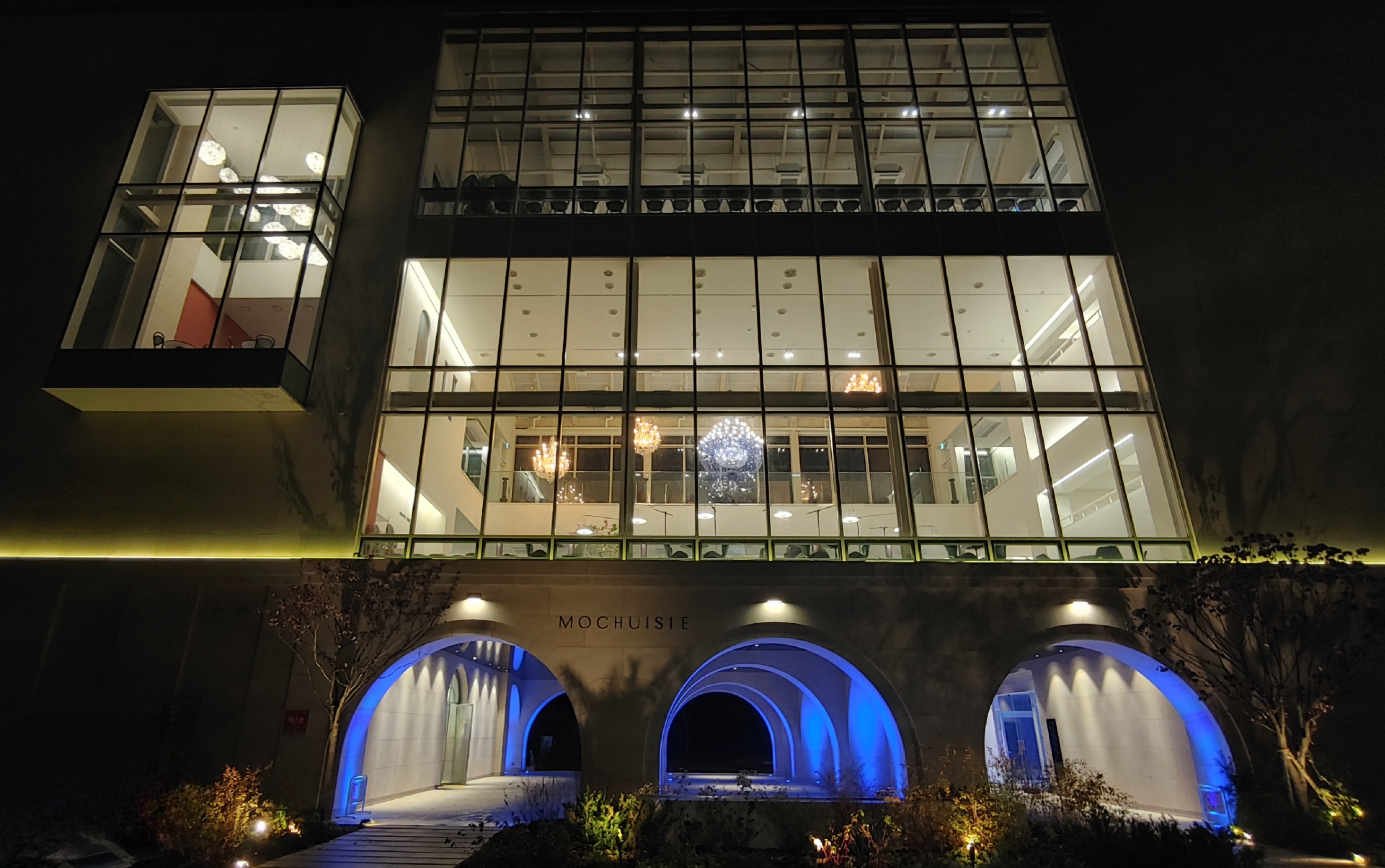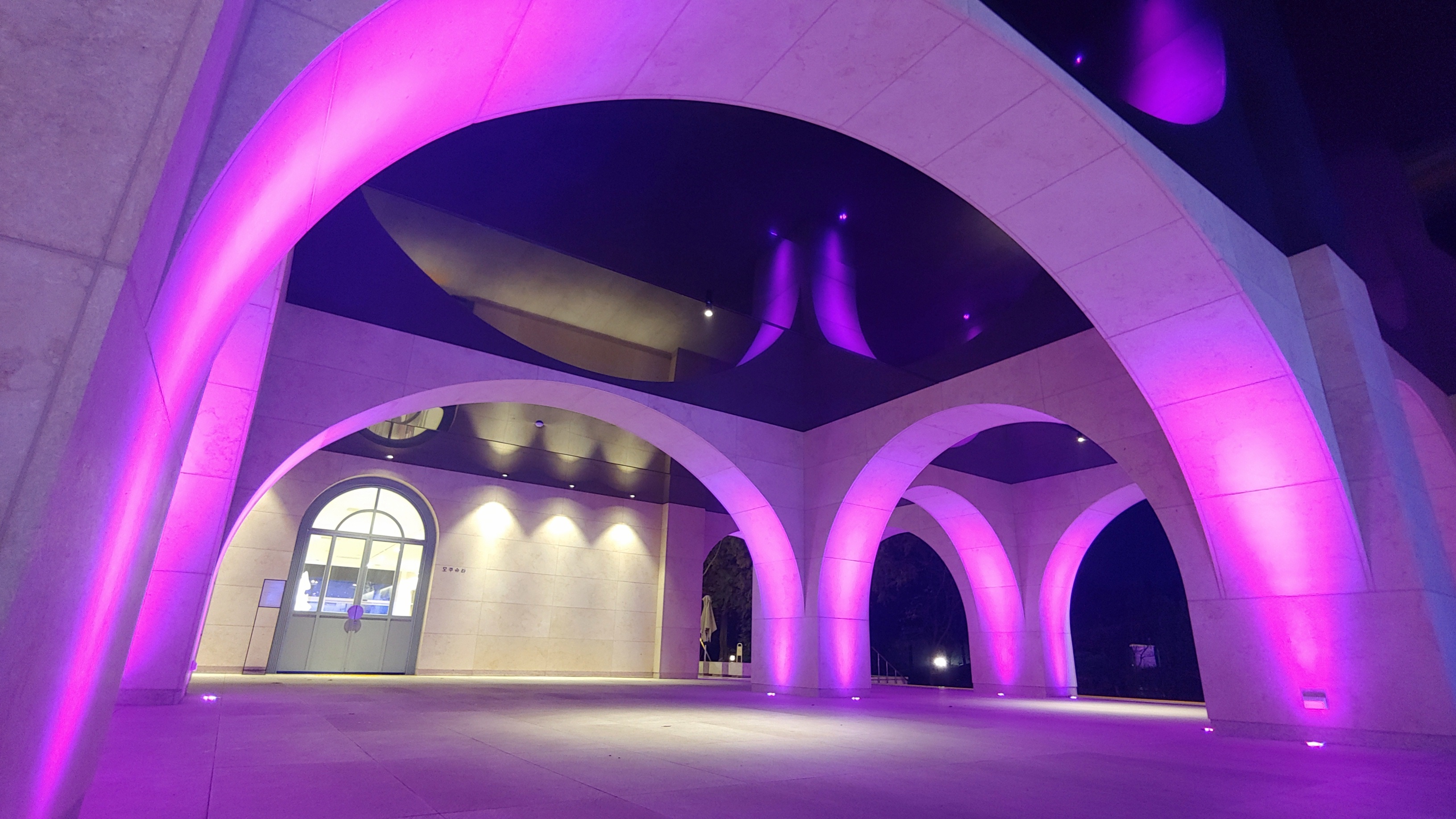 야간에는 1층 아치형 구조물을 비치는 조명이 변한다.