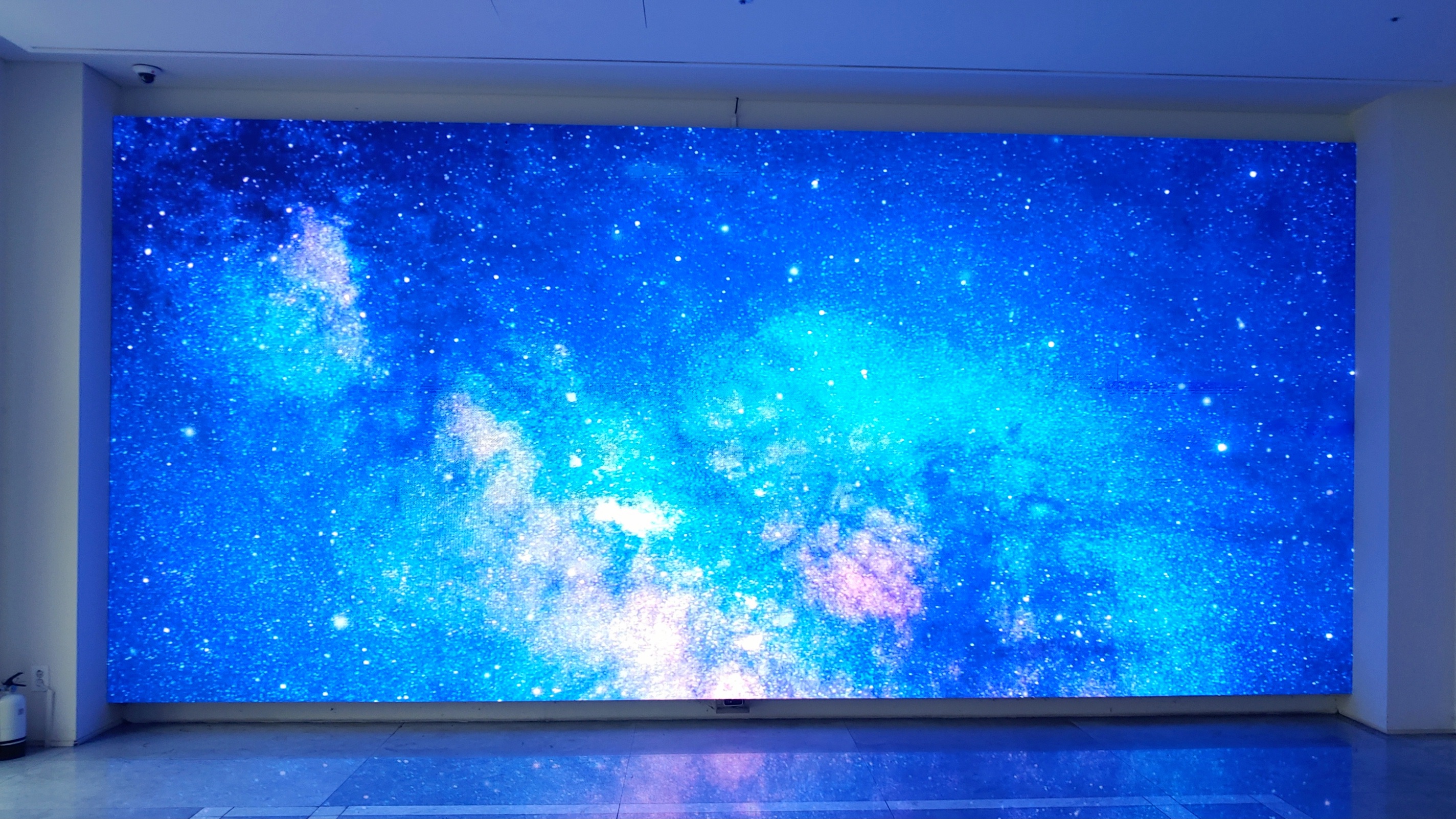 오른쪽으로 들어가면 미디어 아트 옆에 엘리베이터와 2층 카운터로 가는 계단이 있다.