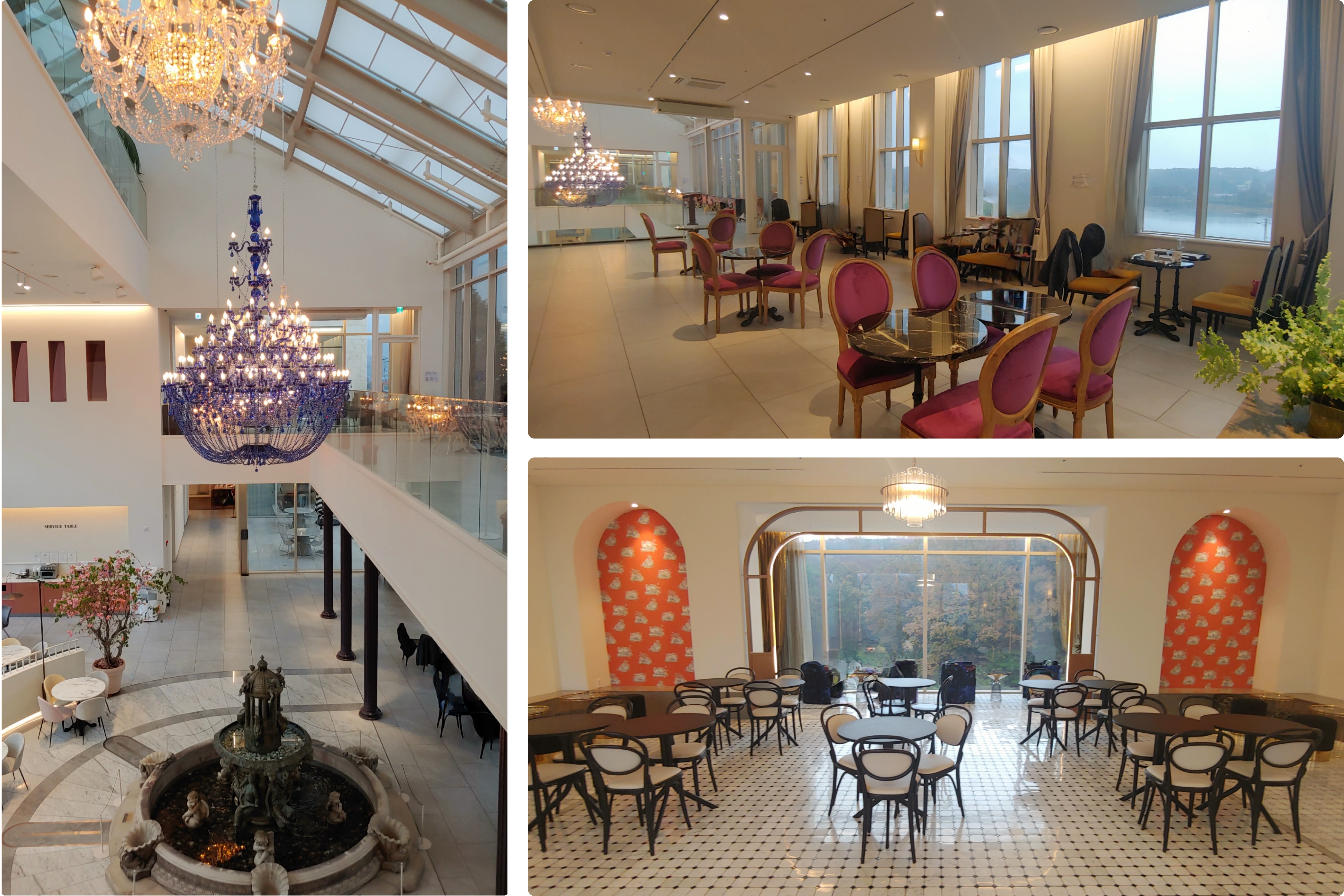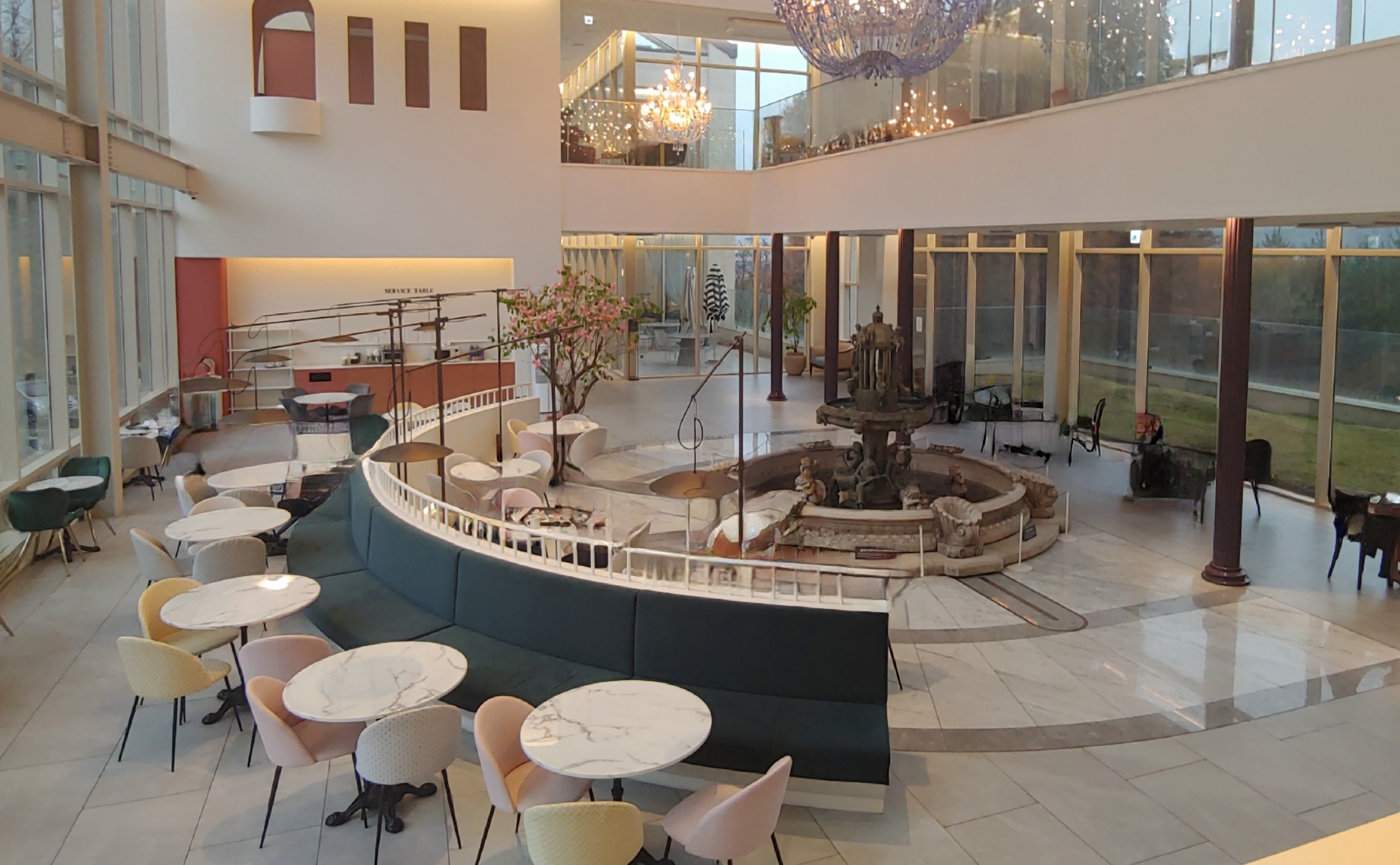 2층 중앙부는 전체 공간이 뚫려 있으며 가운데 분수를 중심으로 양쪽 창가에 모두 자리가 있다.