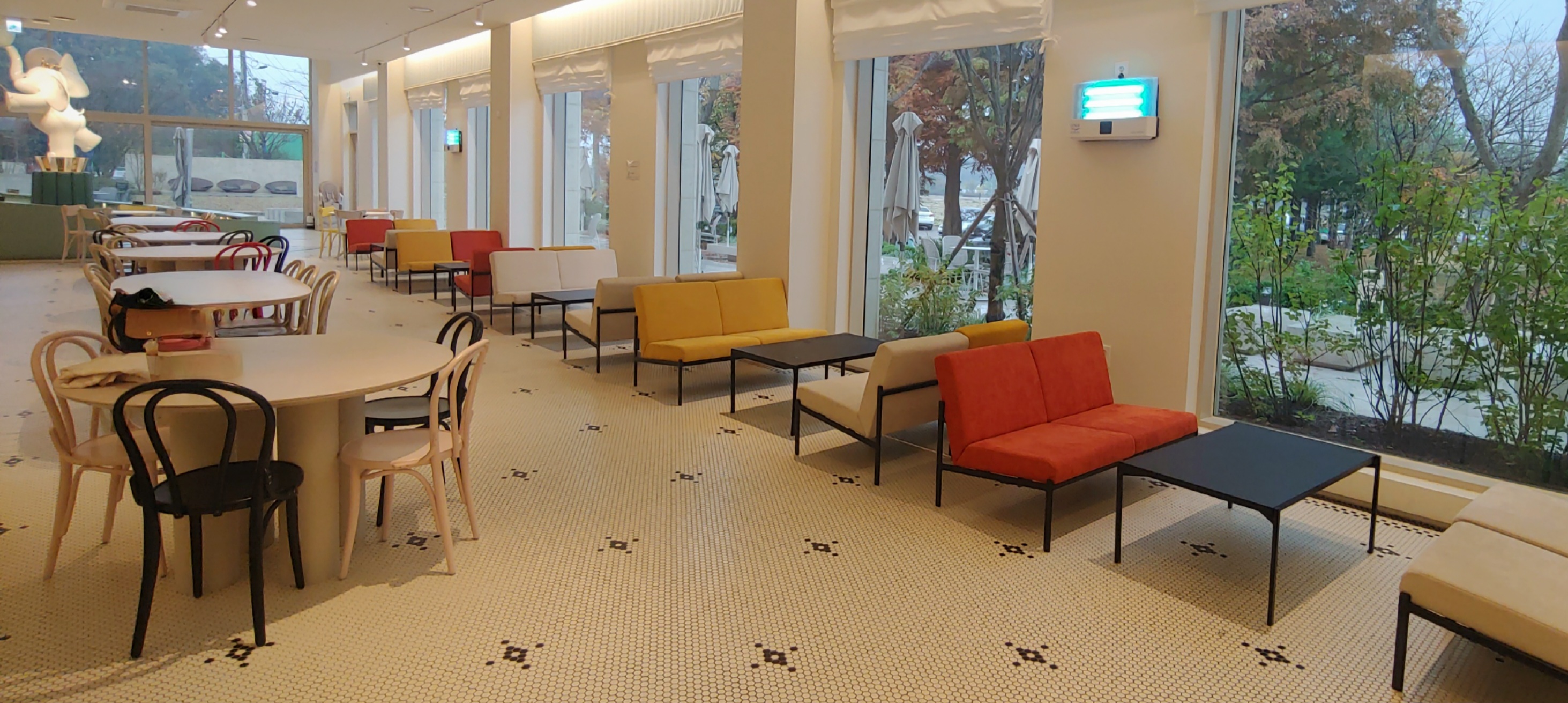 2층에서 카운터 반대편 계단으로 내려가거나 주차장에서 미디어아트 반대편 아치형 문으로 들어가면 1층에 밝은 분위기의 자리가 있다. 한쪽 벽에는 카공용 좌석처럼 벽면에 붙은 자리도 있다.