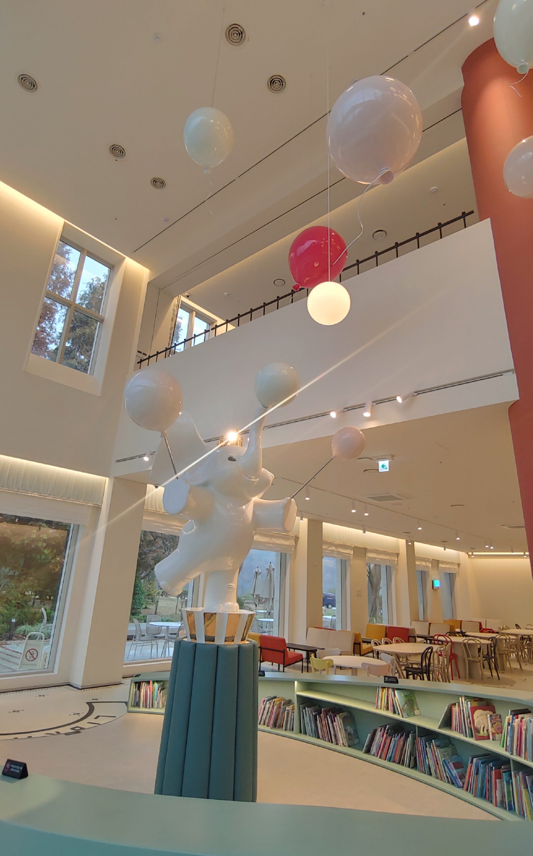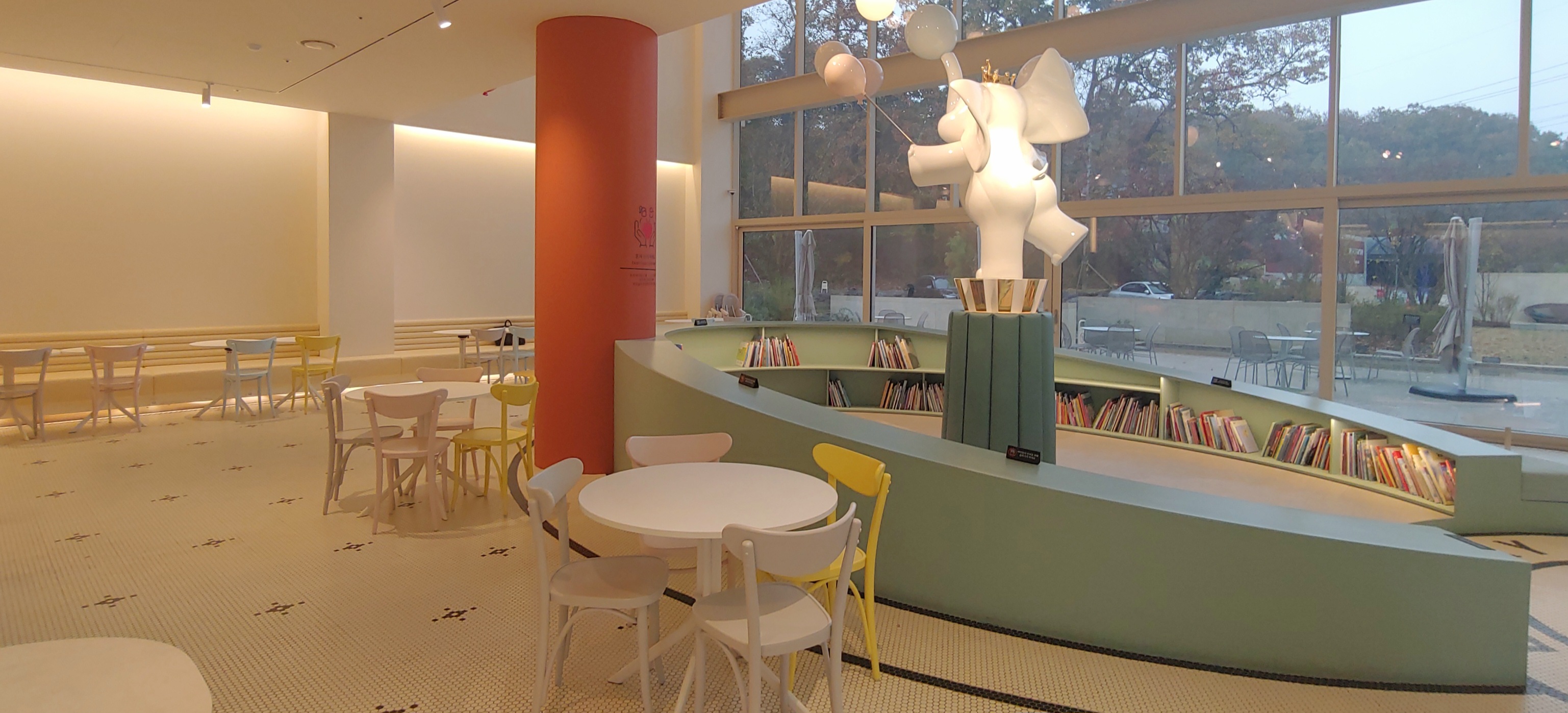 1층은 키즈존으로 코끼리 조각상 둘레에 아이들이 읽을 수 있는 책이 있다.