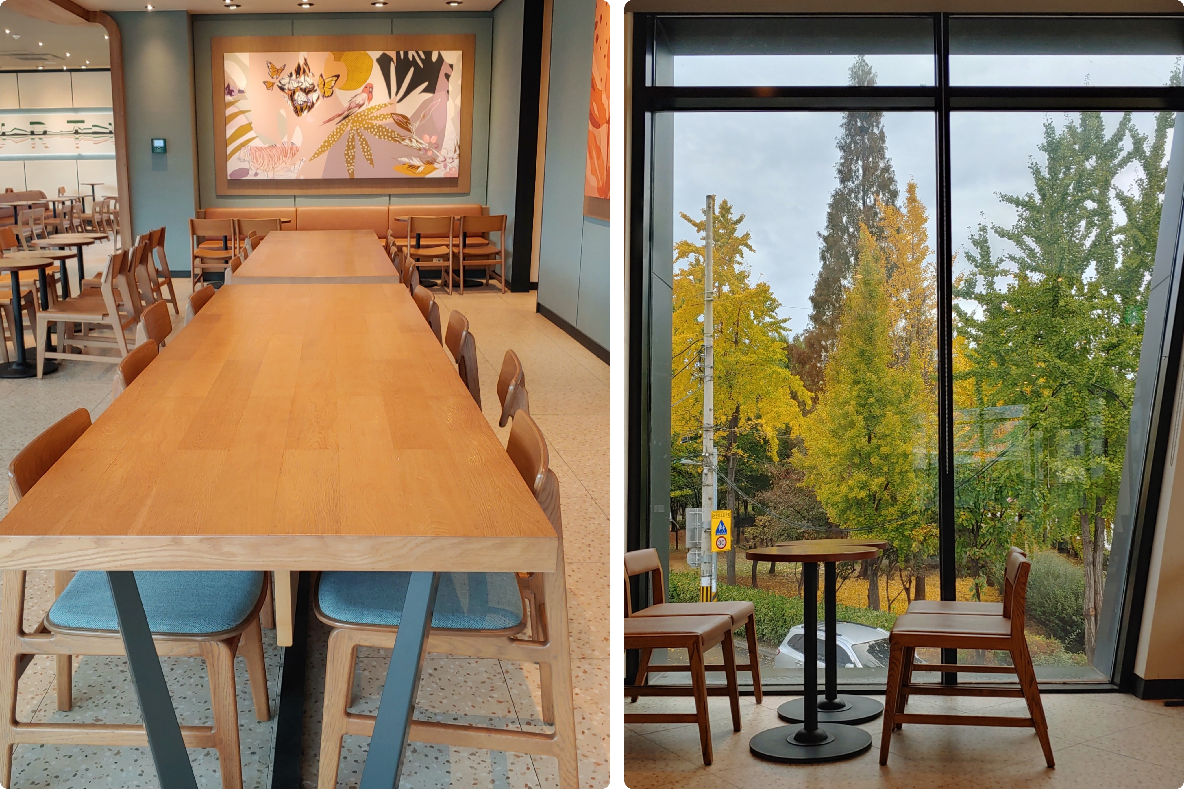다만 중앙공원을 향한 통창 앞에 2인석은 좌석수가 많지 않고 인기가 많다.