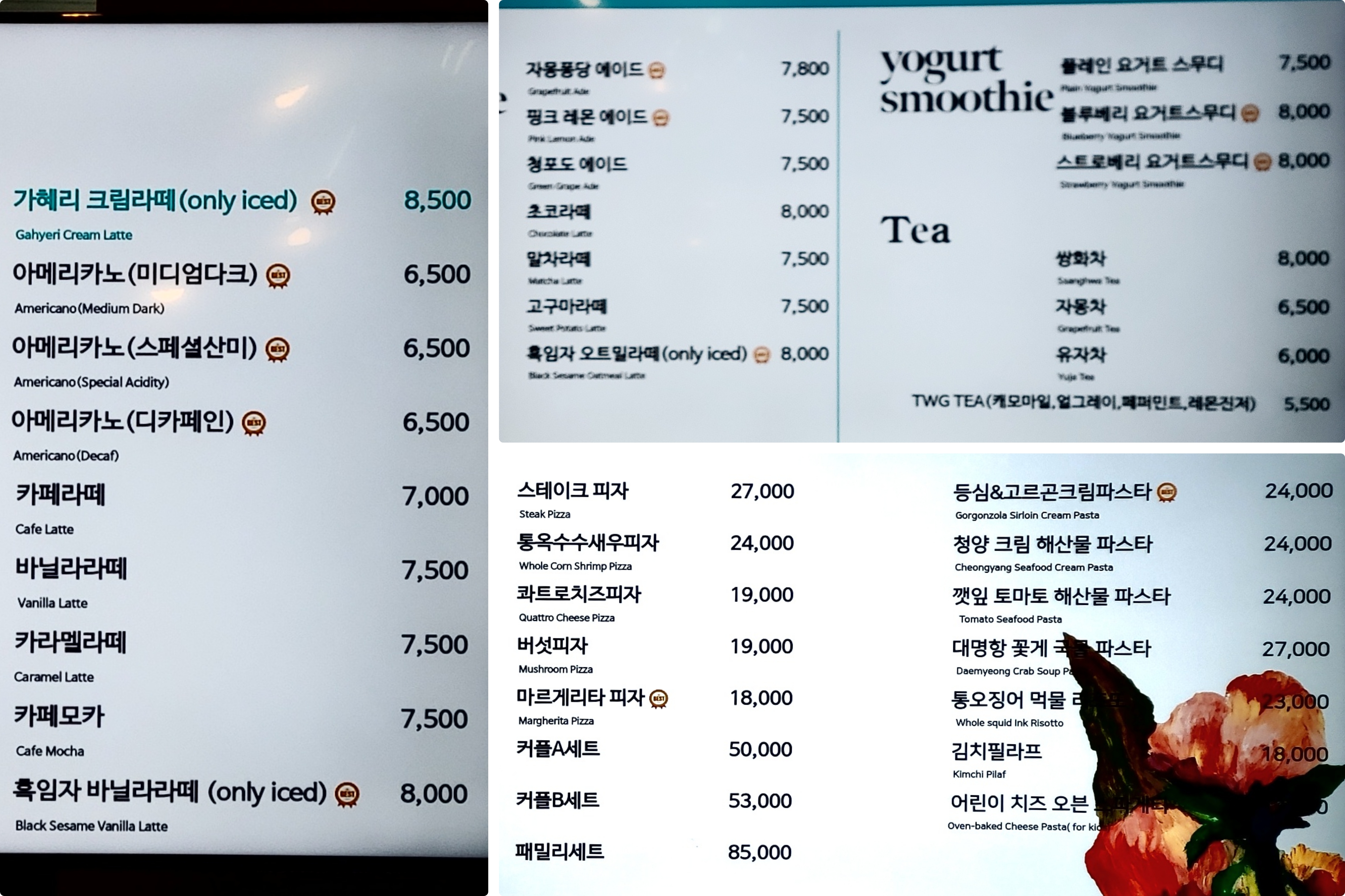 입구에 들어가면 바로 오른쪽 통창 앞에 테이블들이 있는데 주차장 앞이어서 추천할 만한 뷰는 아니다.