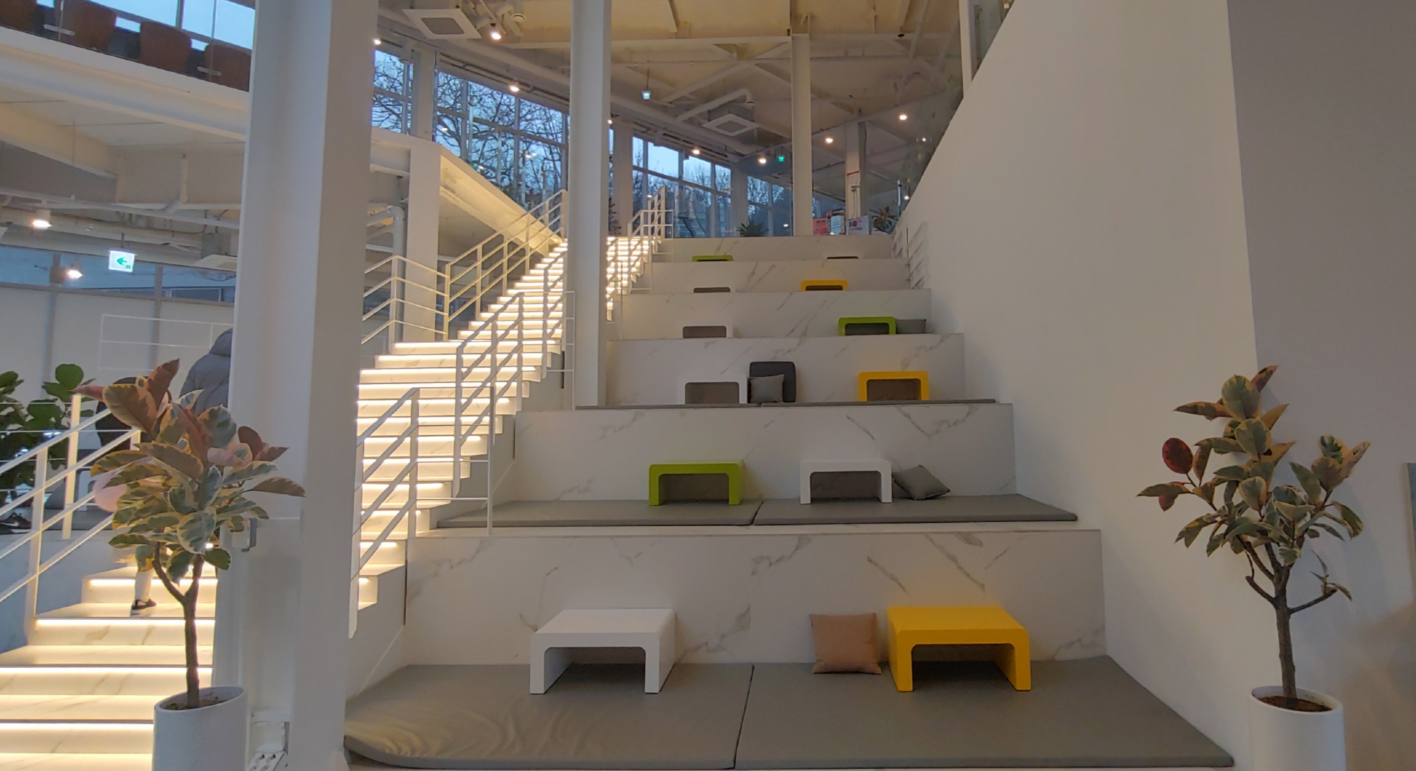 초대형 스크린 뒤를 보면 2층으로 올라가는 계단과 계단식 좌석이 있다.