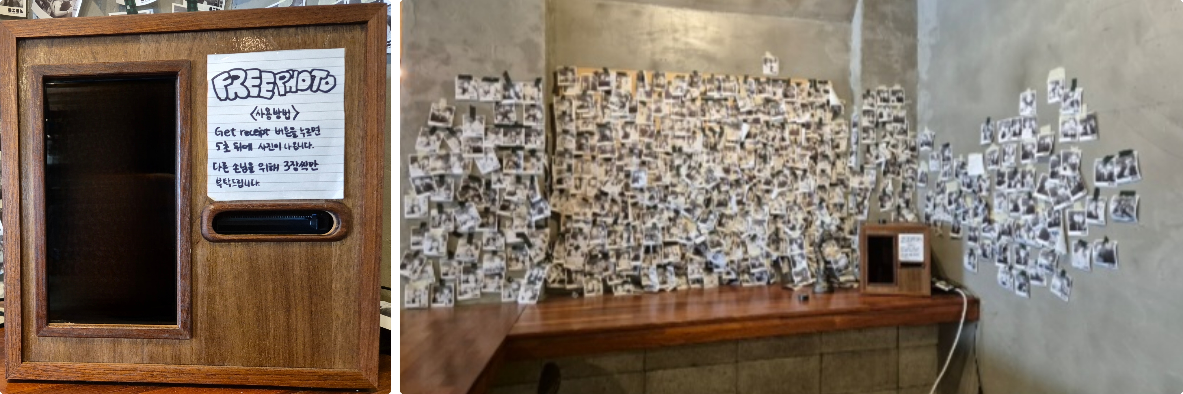 한쪽 벽에 카페를 방문한 사람들이 찍은 폴라로이드 사진들이 붙어있다.